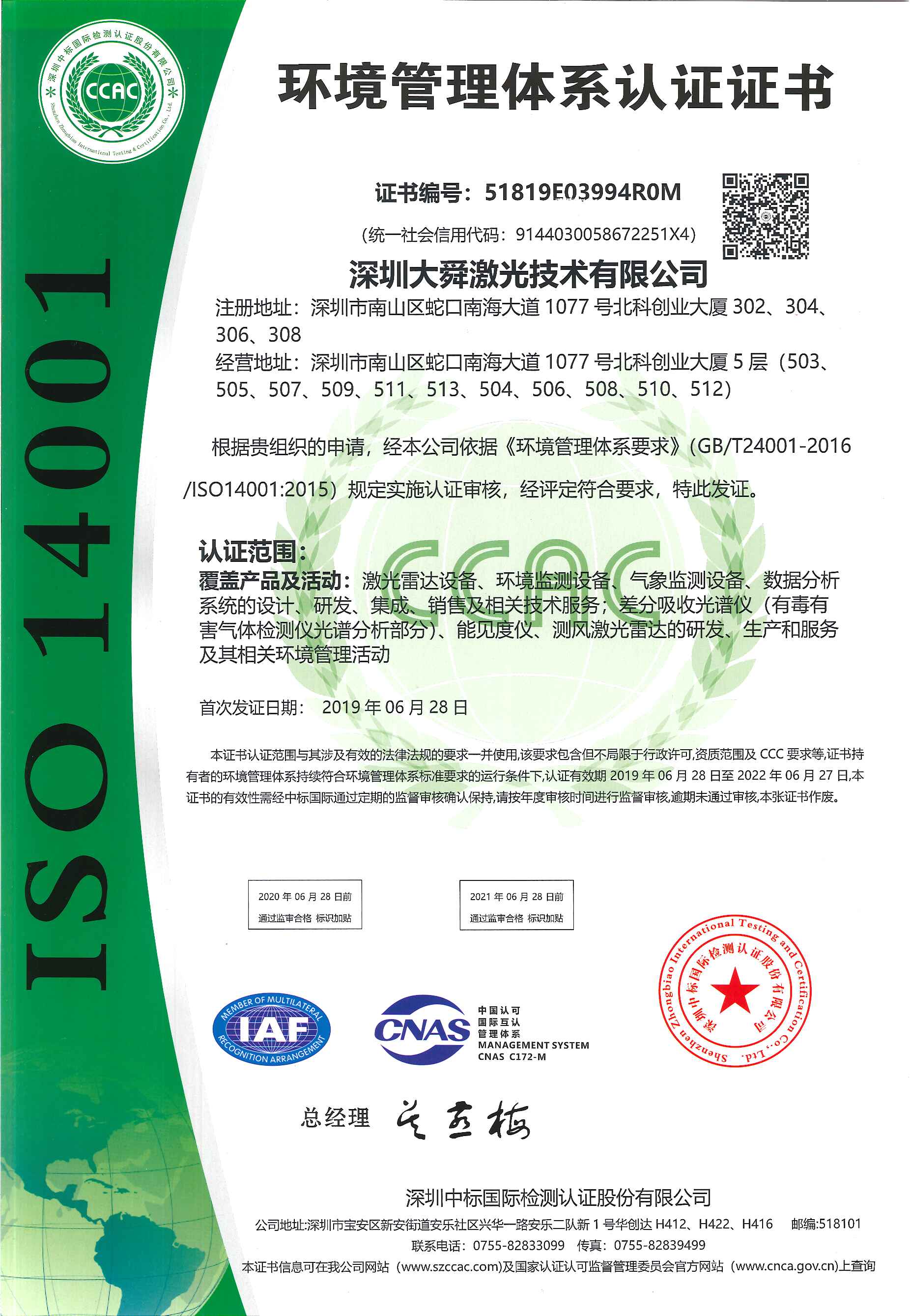 ISO 14001環境管理(lǐ)體(tǐ)系認證證書(shū)